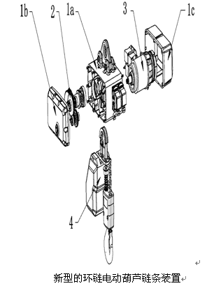 環(huán)鏈電動(dòng)葫蘆主要由減速器,電機(jī)以及鏈條組成,但是由于對減速器,電機(jī)以及鏈條的布局不合理,導(dǎo)致環(huán)鏈電動(dòng)葫蘆的體積較大,同時(shí)環(huán)鏈電動(dòng)葫蘆的零部件數(shù)量很多,由于其零部件多為非標(biāo)零件,生產(chǎn)這些零件還需要定制很多的模具,這就不利于零部件的生產(chǎn)管理,也不利于環(huán)鏈電動(dòng)葫蘆生產(chǎn)過程中風(fēng)險(xiǎn)的控制,而且現(xiàn)有技術(shù)中沒有針對繞于鏈輪上的鏈條進(jìn)行很好的保護(hù),往往在上升過程中容易脫鏈,導(dǎo)致環(huán)鏈電動(dòng)葫蘆的安全性低。