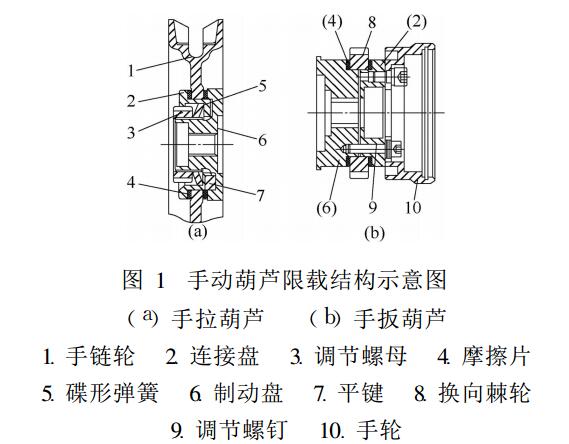 手動葫蘆基本上都采用摩擦打滑的限載原理,當(dāng)載荷力矩大于摩擦力矩時起升失效,也有一些國外的手扳葫蘆采用超載時手扳力超過限制值導(dǎo)致手柄彎曲的間接形式,但因操作方式不同不適用于手拉葫蘆。