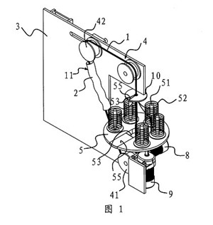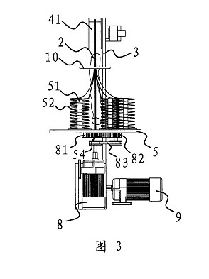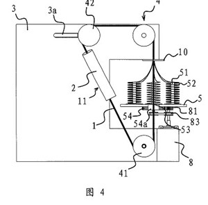 一種環(huán)形穿絲吊裝帶的生產裝置,它包括一塊固定板(3),在固定板(3)上設有用于撐開環(huán)形穿絲吊裝帶(11)的滾輪組(4),滾輪(41)驅動裝置與其中至少一個滾輪(41)相聯(lián)并可通過該滾輪(41)帶動環(huán)形絲吊裝帶(11)轉動,其特征在于,所述的固定板(3)的側部設有一個轉盤(5),在轉盤(5)上設有若干個用于放置線團(52)的線架(51),轉盤(5)具有一個供撐開在滾輪組(4)上的環(huán)形穿絲吊裝帶(11)進入并垂直穿過轉盤(5)中心的缺口(53),上述轉盤(5)與一個當撐開在滾輪(41)組(4)上的環(huán)形穿絲吊裝帶(11)轉動時可帶動轉盤(5)上的各個線架(51)繞環(huán)形穿絲吊裝帶(11)轉動的轉盤(5)驅動裝置相聯(lián)接,所述的轉盤(5)驅動裝置包括一個與電機一(8)相聯(lián)的主驅動齒輪(81),在轉盤(5)的底部中心設有一個與主驅動齒輪(81)相嚙合的轉動齒輪(54),轉動齒輪(54)具有與轉盤(5)上的缺口(53)上下對應的開(54a),在轉動齒輪(54)旁還設有一個副驅動齒輪(82),所述的副驅動齒輪(82)通過同步傳動帶(83)與主驅動齒輪(81)相連。