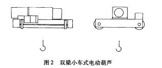 ③雙梁小車式由一臺固定式電動葫蘆和一雙軌型小車組成,該葫蘆小車沿雙梁上的兩條軌道運(yùn)行(見圖2)。