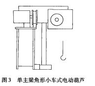 ④單主梁角形小車式由一臺固定式電動葫蘆和一角形電動小車組成。該小車沿安裝在單主梁橋架上的軌道運(yùn)行(見圖3)。