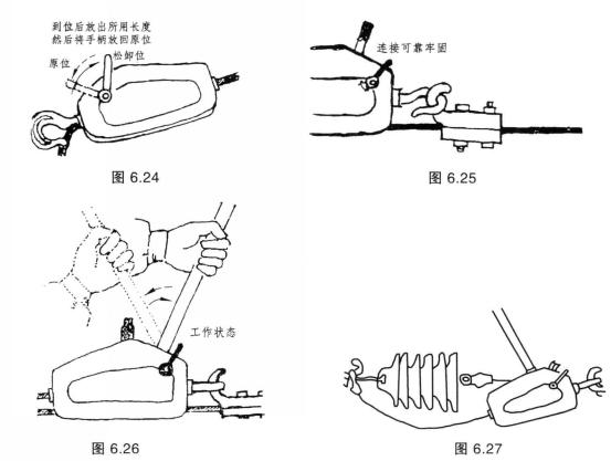 4、操作時,先確認(rèn)松卸手柄已扳到“工作位置”,然后用葫蘆把圓頭(操作手柄)套在前進(jìn)桿上來回擺動,收緊牽引繩使其受力(卸載),如圖6.26所示。
