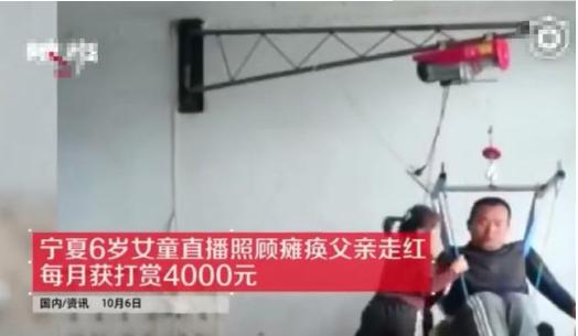 寧夏的一位姓田的男子在兩年前遭遇了車禍,這場車禍也讓男子高位截癱,喪失了工作能力,出事之后,男子的妻子離家出走,并且將女兒留下來了,這么小的年紀(jì),本該快快樂樂無憂無慮的長大,但是卻背上了照顧癱瘓爸爸的重?fù)?dān),由于兩個人實(shí)在沒有生活來源,從一年前開始6歲女兒便直播照顧自已的爸爸,依靠著每個月4000元的打賞生活,但是卻被人質(zhì)疑在“賣慘”。
