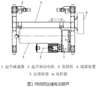該設(shè)備與傳統(tǒng)鋼絲繩電動葫蘆相比較,其主要構(gòu)成部件較為相似,由起升制動電機(jī)、起升減速器、卷筒組、定滑輪梁、端梁裝置和電控箱等組成。
