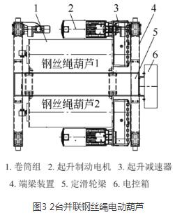 采用4/2倍率繞繩方式,由于第一層鋼絲繩與第二層鋼絲繩在卷筒上有高低差(即鋼絲繩直徑差),卷筒轉(zhuǎn)動時,上下兩層鋼絲繩進(jìn)出繩速度會不一致,因此,通過增加一個平衡滑輪,調(diào)整繩速,使起吊平穩(wěn),解決了以往2臺電動葫蘆并聯(lián)時容易出現(xiàn)的出繩和入繩不同步的現(xiàn)象,提高了鋼絲繩電動葫蘆的使用壽命。