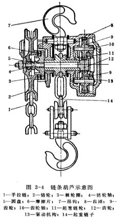 圖3-4為齒輪式手拉鏈條葫蘆。當(dāng)提升重物時,手拉鏈1使鏈輪2按順時針方向轉(zhuǎn)動。鏈輪2沿著圓盤5套筒上的螺紋向里一動,而將棘輪圈3和摩擦片6都壓緊在鏈輪軸4上(鏈輪軸4與圓盤5牢固形成一體),棘輪圈3只能順時針方向轉(zhuǎn)動,棘爪在棘輪圈3上跳動發(fā)出嗒嗒之聲。鏈輪軸4右端的齒輪12帶動齒輪9(或稱行星齒輪)與固定齒圈8相嚙合,使齒輪9沿鏈輪軸4為中心順時針方向移動。同時帶動驅(qū)動機(jī)構(gòu)13和起重鏈輪11轉(zhuǎn)動,使起重鏈子14上升。當(dāng)不拉手拉鏈之后,重物是靠自重產(chǎn)生的自鎖現(xiàn)象和棘爪組織棘輪圈3逆時針方向轉(zhuǎn)動而停止在空中。反之,當(dāng)松下重物時,手拉鏈1使鏈輪2和圓盤5分離。則鏈輪軸4右端的齒輪12帶動齒輪9與固定齒圈8相嚙合,使齒輪9沿鏈輪軸4為中心逆時針方向轉(zhuǎn)動,同時帶動驅(qū)動機(jī)構(gòu)13和起重鏈輪11轉(zhuǎn)動,使起重鏈子14下降。當(dāng)不拉手拉鏈之后,因鏈輪2停止轉(zhuǎn)動時,起重鏈輪11受重物自重還要繼續(xù)沿逆時針方向轉(zhuǎn)動,行星齒輪傳動機(jī)構(gòu)同樣沿逆時針方向繼續(xù)轉(zhuǎn)動,使圓盤5、摩擦片6及棘輪圈3相互之間相互壓緊而產(chǎn)生摩擦力,棘輪圈3受棘爪阻止不能向逆時針方向轉(zhuǎn)動,于是摩擦力作用在螺紋上產(chǎn)生自鎖,使重物停止在空中。