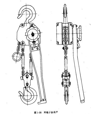 環(huán)鏈手扳葫蘆的結(jié)構(gòu)如圖1-28所示,它采用一級齒輪轉(zhuǎn)動,主要有齒輪軸、齒輪、制動器、起重鏈條、鏈輪、吊鉤、操作手柄等。