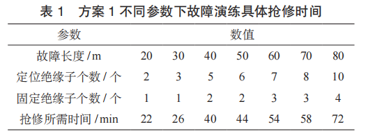 根據(jù)接觸網(wǎng)塌網(wǎng)故障長(zhǎng)度的不同,以及定位和固定絕緣子個(gè)數(shù)的不同,方案1故障演練具體搶修時(shí)間見表1,處理完畢后經(jīng)判斷具備送電條件后即可送電,列車限速通過。