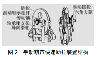 手拉葫蘆快速助拉裝置可以固定手拉葫蘆的手拉鏈條,給手拉鏈條提供拉力以提升重物,驅(qū)動(dòng)力可通過(guò)鏈輪外接電機(jī),也 可以通過(guò)內(nèi)六角接頭外接氣動(dòng)扳手。 該裝置由鏈輪、滾動(dòng)軸承組件、傳動(dòng)軸、軸承座支架、導(dǎo)向滑輪、驅(qū)動(dòng)鏈輪和外六角方驅(qū)組成(圖 2)。