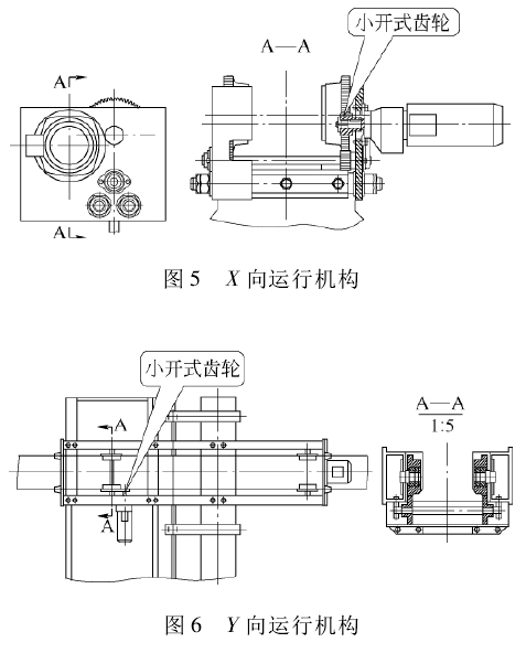 X、Y運行機構采用H型鋼運行軌道,為解決輪壓分布不均勻,易打滑的現象,車輪采用小開式齒輪—+同步開式齒輪裝置傳動的形式,運行機構采用三合一減速電動機,結構簡單,運行平穩(wěn),安全可靠。X、Y運行機構見圖5和圖6。