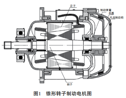 錐形轉(zhuǎn)子制動(dòng)電機(jī)其定子內(nèi)腔和轉(zhuǎn)子外形均為圓錐形,轉(zhuǎn)子的每一個(gè)矽鋼片直徑都不相同,制動(dòng)彈簧只有一根,制動(dòng)輪和摩擦片均為環(huán)狀的圓錐面結(jié)構(gòu)。