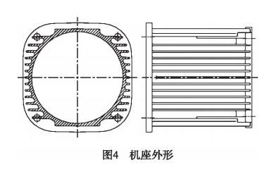 機(jī)座外形如圖4所示。取消上部葉片以滿足定子外徑的需要,下部葉片也相應(yīng)取消,一方面是為了對(duì)稱設(shè)計(jì),減少機(jī)座變形,同時(shí)也是美觀的需要;另一方面,下部機(jī)座外形平整,便于電機(jī)運(yùn)輸、裝配和維護(hù)等。兩側(cè)葉片采用水平方向葉片,外形協(xié)調(diào)美觀。機(jī)座采用鋁合金壓鑄件,壓鑄件尺寸精度較高,一般為IT5-IT7,可以減少毛坯的加工余量,減少切削工作量;鋁合金材料利用率高,既節(jié)約材料又節(jié)省加工工時(shí);壓鑄件表面粗糙度小,一般可達(dá)到3.2-0.8,有良好的外觀質(zhì)量;壓鑄件抗拉強(qiáng)度高;壓鑄件質(zhì)量穩(wěn)定,可滿足大批量生產(chǎn)。