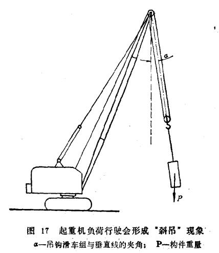 因?yàn)槠鹬貦C(jī)負(fù)衙行駛時(shí),由于道路不平或慣性原因,構(gòu)件總難免要發(fā)生擺動(dòng)而使起重機(jī)吊鉤滑車(chē)組離開(kāi)垂直線位置,形成“斜吊”,如圖17所示。如果起重機(jī)吊著重量為P的構(gòu)件已是滿(mǎn)負(fù)荷。則當(dāng)梅件擺動(dòng)后,實(shí)際就是格負(fù)荷了。構(gòu)件擺動(dòng)的夾角a如過(guò)大,傾覆力矩增大,起重機(jī)就可能翻車(chē)。因此,起重機(jī)滿(mǎn)負(fù)荷時(shí)要盡量避免行駛。如需作短距離行駛,只熊將構(gòu)件吊離地面20—30厘米,且要慢行,還必須拉好溜繩,控制構(gòu)件擺動(dòng)。更多問(wèn)題解答關(guān)注凌鷹電動(dòng)葫蘆專(zhuān)業(yè)廠家。